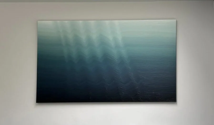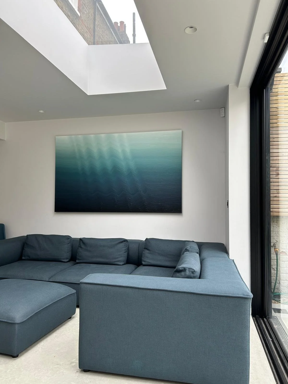 This commission was based on on an existing work' More Light Coming Through' which was a bit small for the area. It is an original artwork in itself so had some changes. More "Light Shafts" as it is a larger canvas but keeping the general colours. A brief and delivered price was agreed. It was delivered after 6 weeks as it was dry enough but will have to be varnished in situ after 6 months when it is fully dry. I use a matt varnish which balances and protects the colours and finish and ensures the artworks longevity.